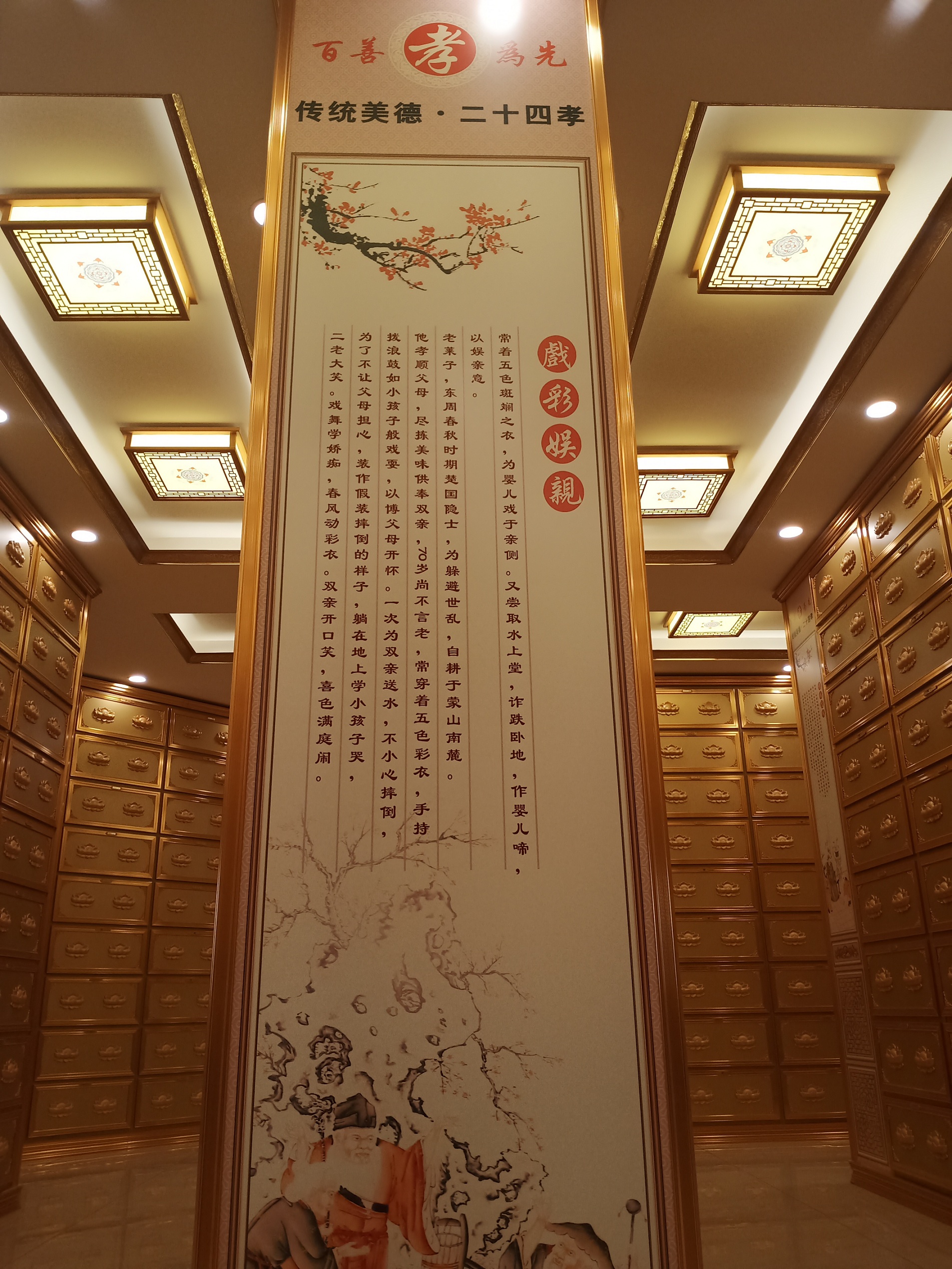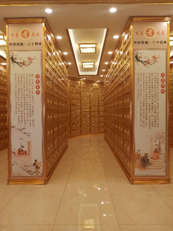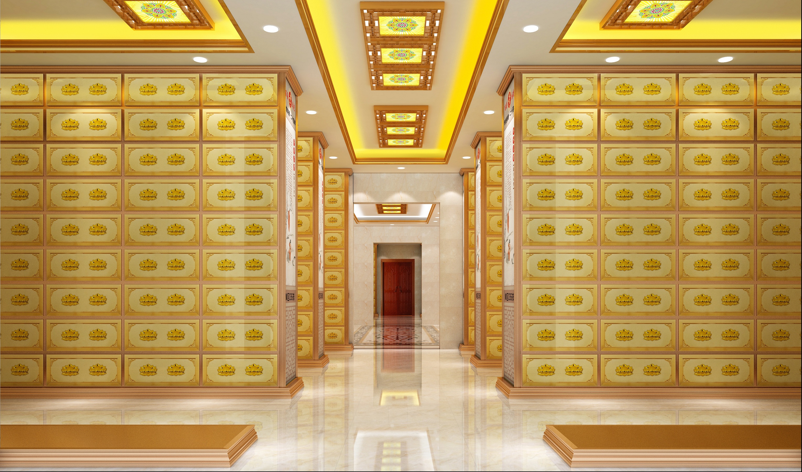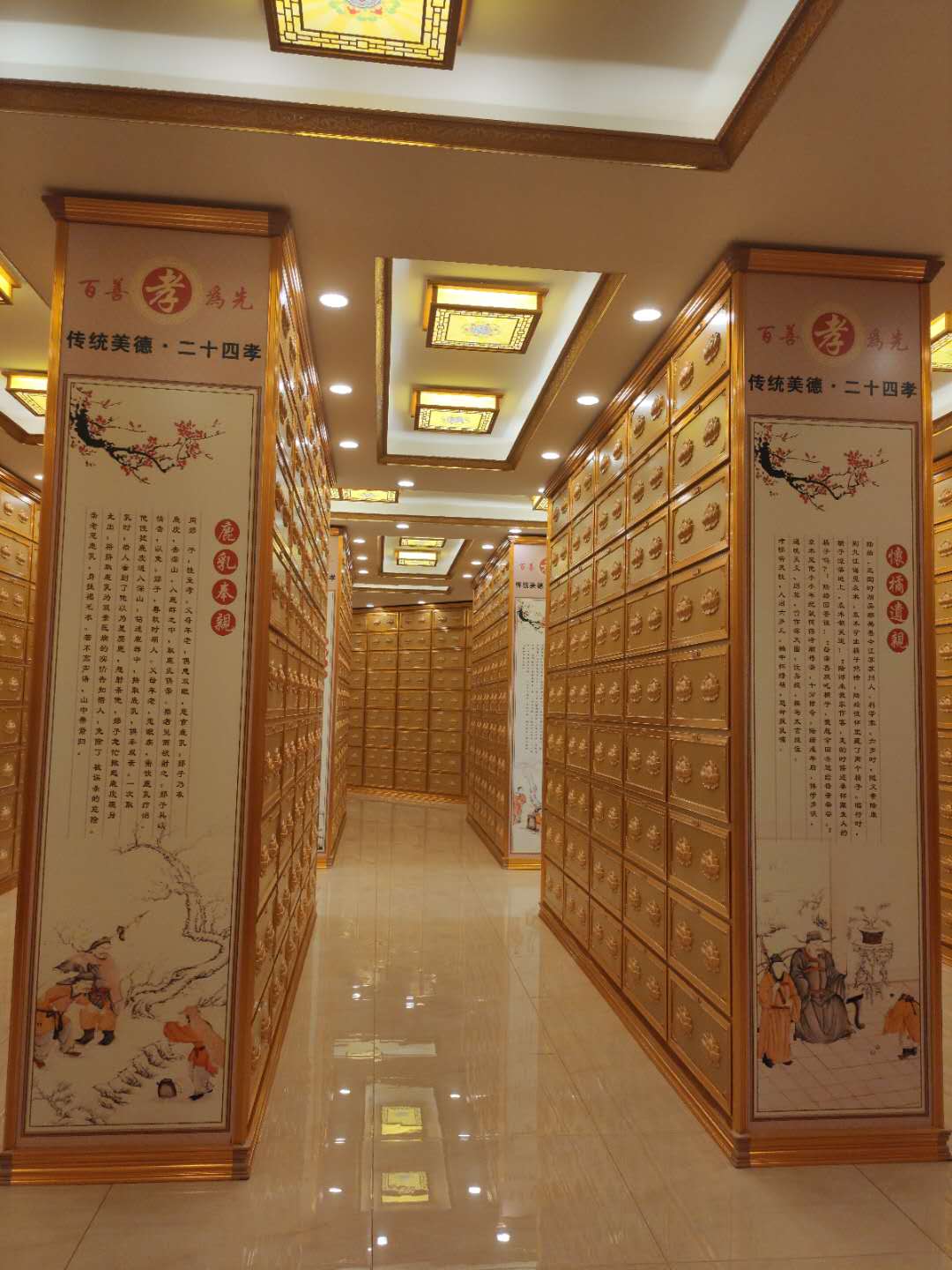 塔葬方式是順應國家殯葬改革的大局, 祥和園“萬壽報恩塔”三樓、四樓現已重裝完畢。我們采用了全新的裝修風格,整層樓給人金碧輝煌的視覺效果,出電梯首先映入眼簾的是對面墻壁上般若波羅密多心經;兩部電梯之間是每層樓的平面圖,方便客戶按圖尋找排位號;每個區的排頭處是中國24孝典故;兩層樓共計5千7百多個閣位,分單閣位和雙閣位,滿足不同需求的客戶選擇;閣位外觀以蓮花座裝飾,蓮花寓意人心純凈,象征著清廉坦蕩,圣潔美好;獨特的鎖孔設計,放在排號條碼下面,不會因天氣或時間久遠導致生銹無法打開。